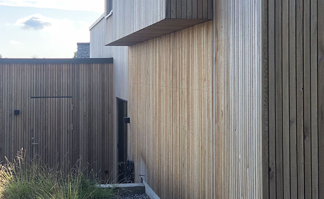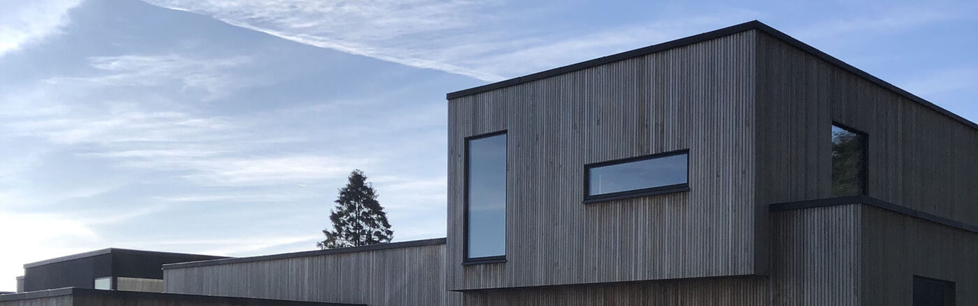Hos LTM kan vi lidt af hvert, og vi tegner og bygger derfor både klassiske villahuse med saddeltag og funkisinspirerede huse med fladt tag. Vi bygger dog også huse som dette, der med et forskudt plan og træbeklædning giver et spændende arkitektonisk og æstetisk udtryk til huset.