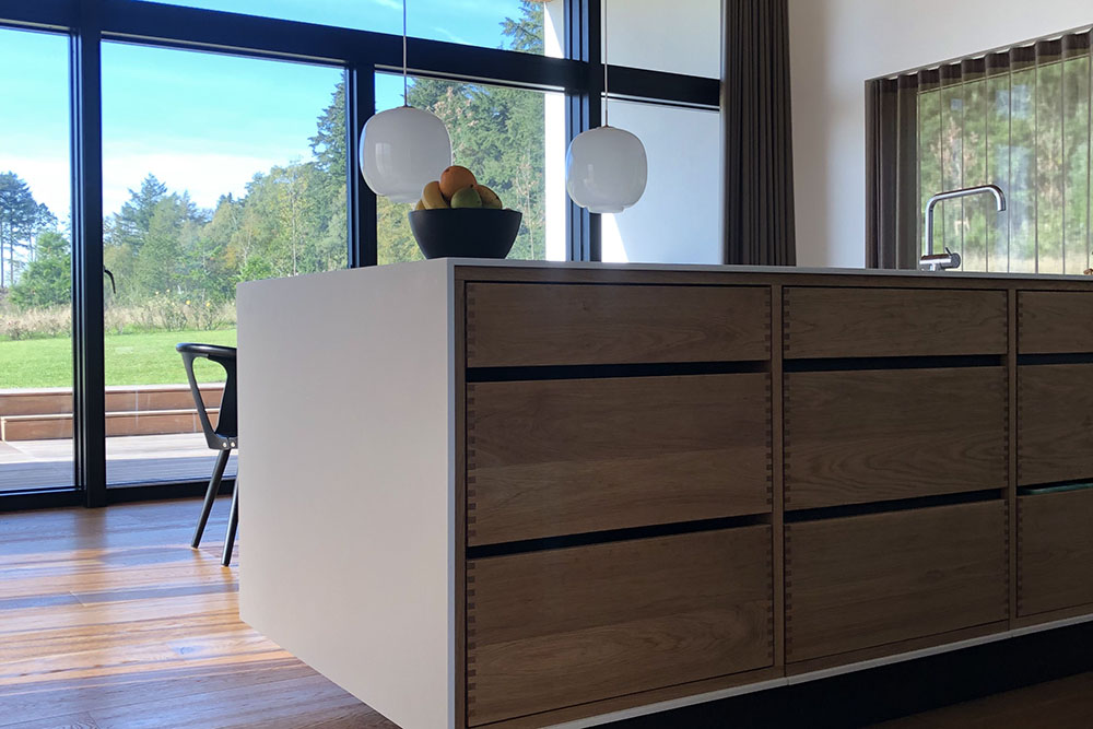 Den sorte farve er dermed gennemgående for det udvendige såvel som det indvendige æstetiske udtryk. På samme måde har vi valgt at benytte træ som et af de gennemgående materialer på både husets facade og indvendig. I husets rum er lavet listelofter, trægulv og lyst snedker inventar, der står i flot kontrast til den sorte farve.