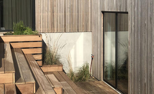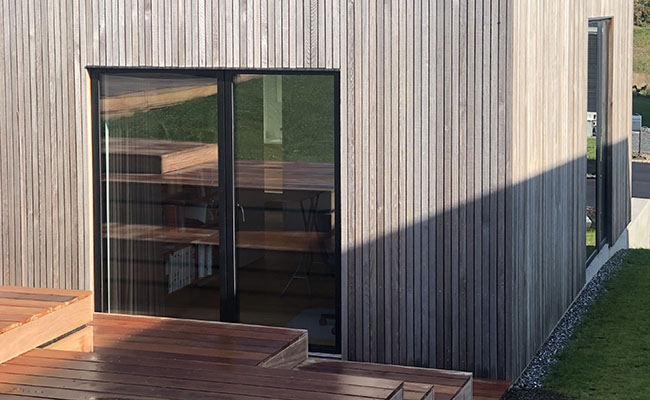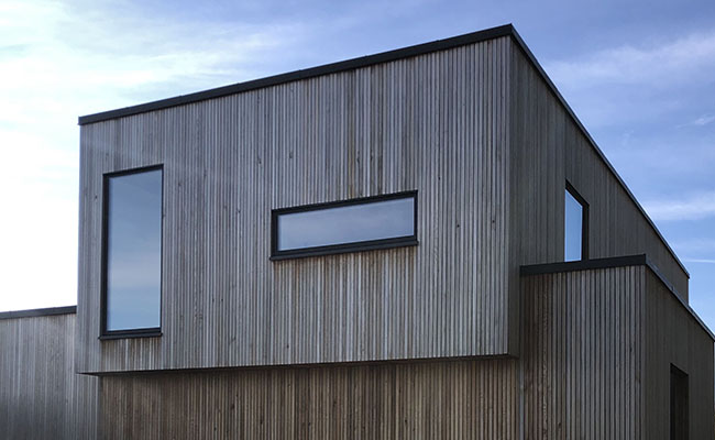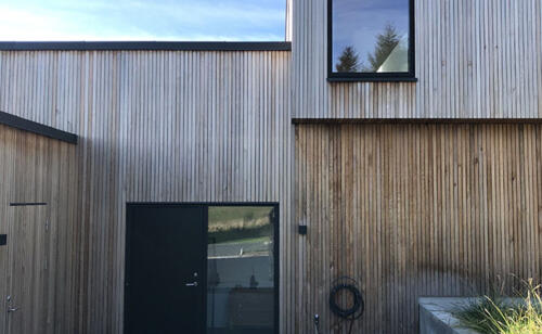 På huset har vi valgt at lave sorte vinduespartier både inde og ude. Den sorte farve går desuden igen på både hoveddøren, taget og garageporten. Tilsammen skaber de en flot kontrast og kant til den lyse træbeklædning på husets facade.