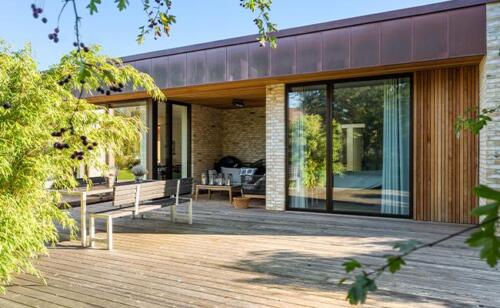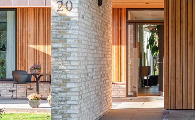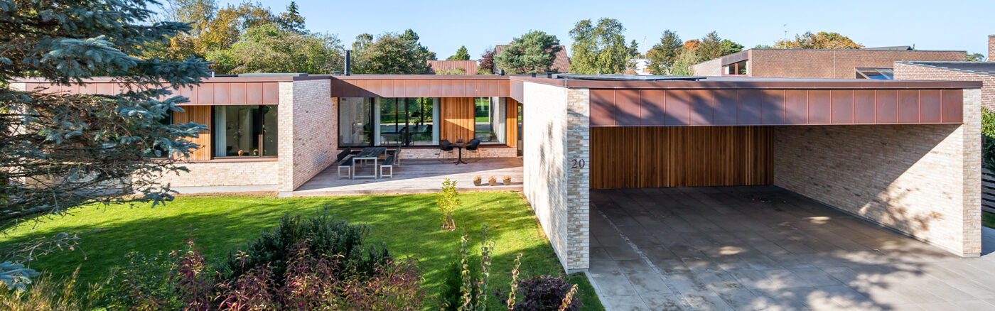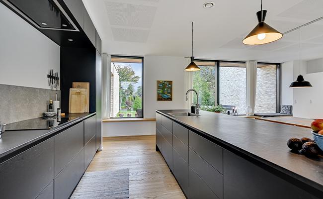 På huset har vi lavet sorte vinduesrammer både indvendig og udvendig for at skabe en kontrast til de gule mursten, cedertræet og kobberinddækningerne. Den sorte farve går desuden igen på hoveddøren samt i inventaret i køkkenalrummet, hvilket også skaber en flot kontrast til de hvide vægge og loft.