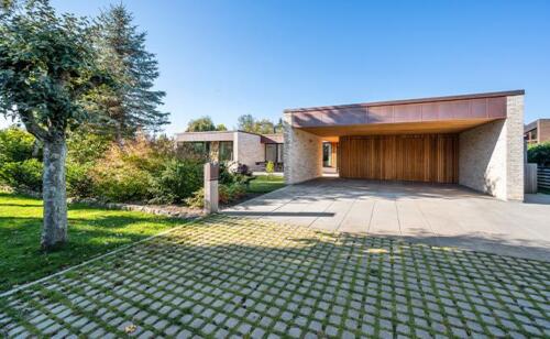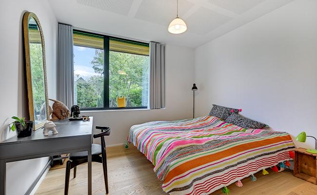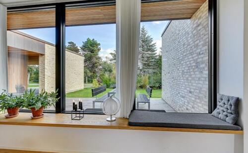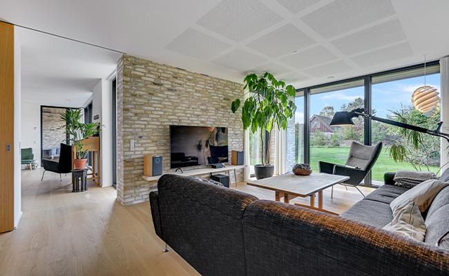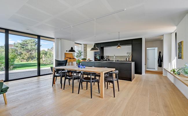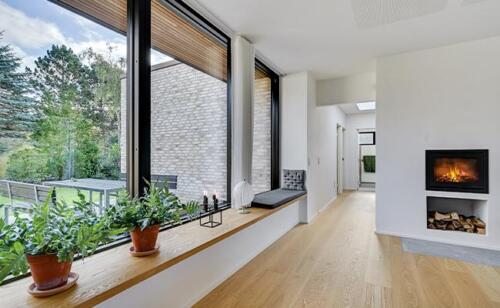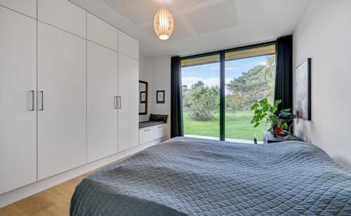 De store rumhøje vinduespartier og ovenlyset i huset sikrer, at der kommer masser af lys ind i rummene. Samtidig har vi lavet indmurede dørkarme og skydedøre i flere af rummene, hvilket gør, at rummene virker større og mere åbne.