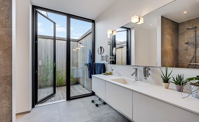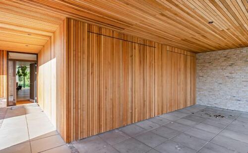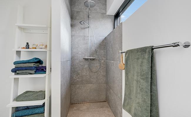På husets terrasse er vi desuden bygget en udebruser, hvorfra der er direkte adgang gennem en skydedør til badeværelse og badekar. Skydedøre ud til terrassen er med til at binde inde og ude sammen, og gør det desuden nemmere for familien at komme ind og ud fra udebruseren til badet indendørs.