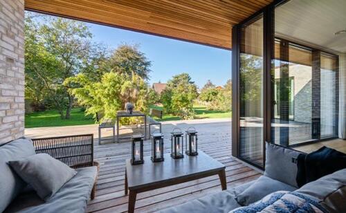 Til huset har vi både lavet en stenterrasse på husets front samt en stor træterrasse på husets bagside. Med to terrasser har familien mulighed for at sidde ude og nyde både morgen- og aftensolen. På husets bagside har vi blandt andet også lavet et overdækket yderrum mellem husets vægge, der både skærmer for solen på varme sommerdage, og samtidig forlænger tiden man kan være ude på terrassen om sommeren.