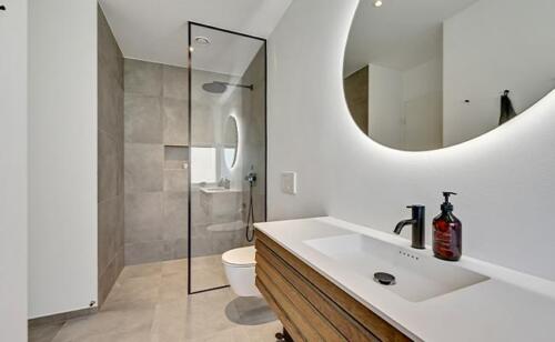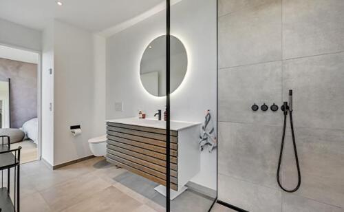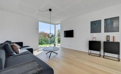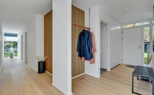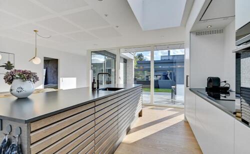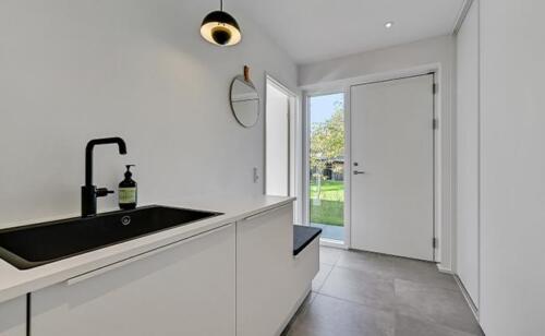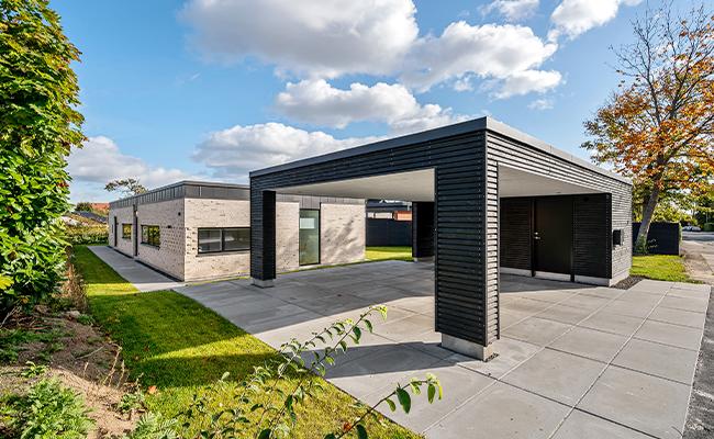 Ved alle vores arkitekttegnede huse sørger vi for, at huset er tilpasset grunden. Det betyder blandt andet også, at vi kan bygge huset i forskellige niveauer alt efter behov og ønske. Ved dette hus havde kunden et ønske om, at huset blev placeret nede på grunden, hvilket også afspejler indretningen og opbygningen af terrassen.