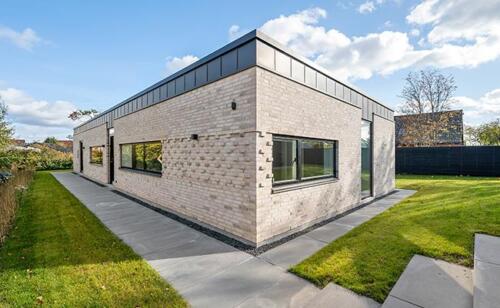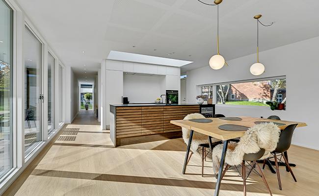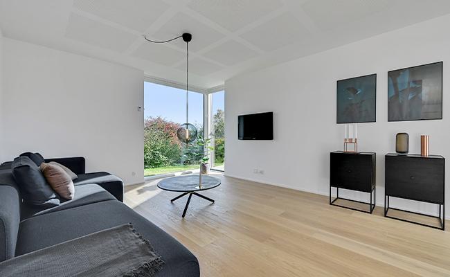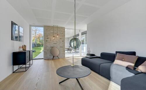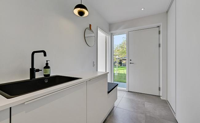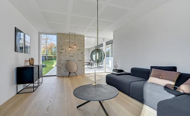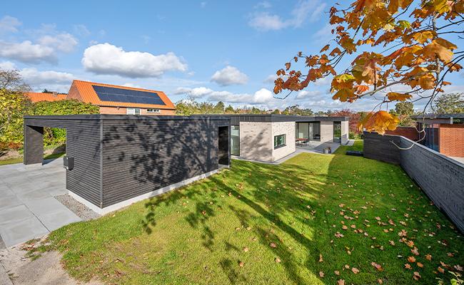 Til murværket har vi brugt bæredygtige Wienerberger mursten, der er trukket ind i stuen, hvor de skaber en flot kontrast til de øvrige hvide vægge. De gule mursten skaber desuden en kontrast til både de sorte vinduespartier og den mørke inddækning på huset, hvilket også er med til at give huset et moderne udtryk.