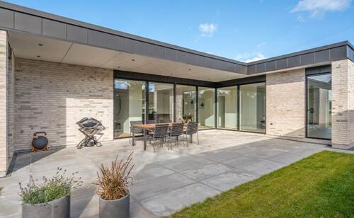 Husets terrasse har vi således bygget, så denne også ligger nede på grunden plant med huset. På terrassen har vi desuden lavet en overdækning, der går ud fra husets tag, og som dermed forbinder ude og inde. Overdækningen spiller sammen med facaden, og sikrer, at der ikke sker overophedning af terrassen. Dermed kan familien sidde ude i skyggen på de solrige sommerdage.