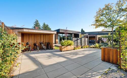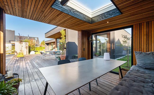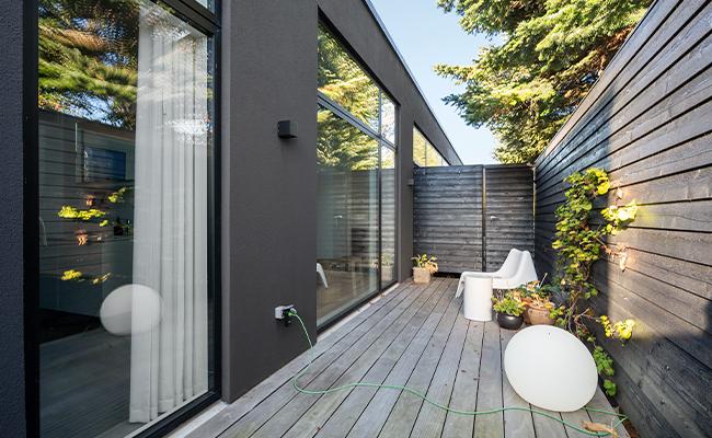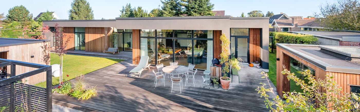 Huset har en stor træterrasse med et udekøkken, som giver familien mulighed for at lave mad og sidde udenfor at spise. Udekøkkenet er desuden overdækket, hvilket sikrer mod overophedning. Til huset har vi bygget et redskabsskur samt et lysthus, der er lavet som en moderne tænkning af en udestue. Begge bygninger er bygget i matchende cedertræ, hvilket er med til at binde de to bygninger sammen med resten af huset. Cedertræ er et flot kvalitetsmateriale, men er samtidig også et forholdsvist vedligeholdelsesfrit materiale, hvis det bliver olieret. Dette gør det derfor også til et godt materiale at bruge til husets facade og de øvrige bygninger.