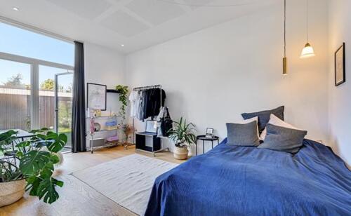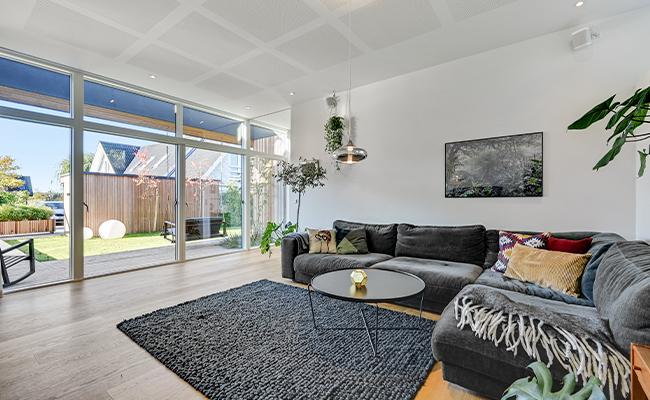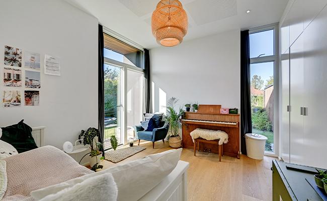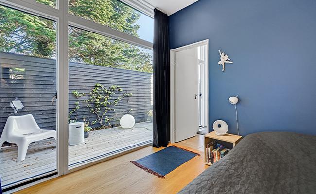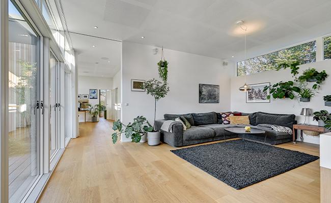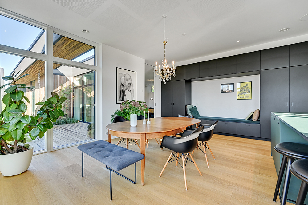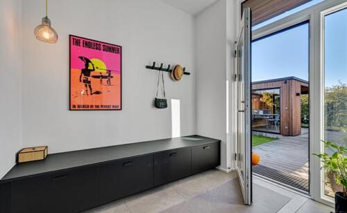 Fra både stuen og køkkenalrummet er der adgang ud til terrassen gennem store lofthøje skydedøre. I flere af husets rum er der desuden lavet gulv til loft samt væg til væg vinduer, der er med til at give masser af lys ind i huset. I alle husets opholdsrum er der derudover hvidt loft med akustikfelter og indbyggede højtalere, hvide vægge og vinduer samt plankegulve, der er med til at gøre huset lyst og indbydende. Fra entréen til stuen er der desuden lavet fugede dørkarme uden gerigter, hvilket giver gennemblik gennem huset og gør huset mere åbent.