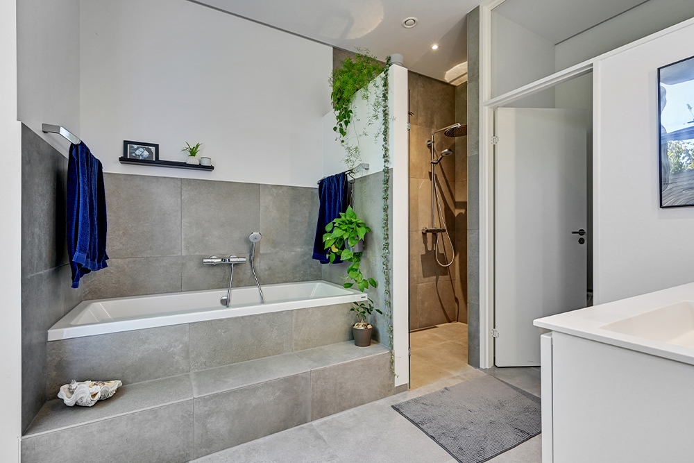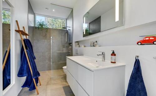På begge badeværelser er der brugt betongrå fliser, der matcher farven på husets facade. I det ene badeværelse er der lavet bruseniche og en lang indbygget niche i væggen over vasken, der giver mulighed for opbevaring af badeværelsesartikler og dekoration af badeværelset. I det andet badeværelse er der både lavet bruseniche samt et indbygget badekar, der er finmuret med betongrå fliser.