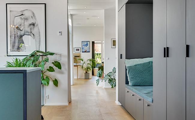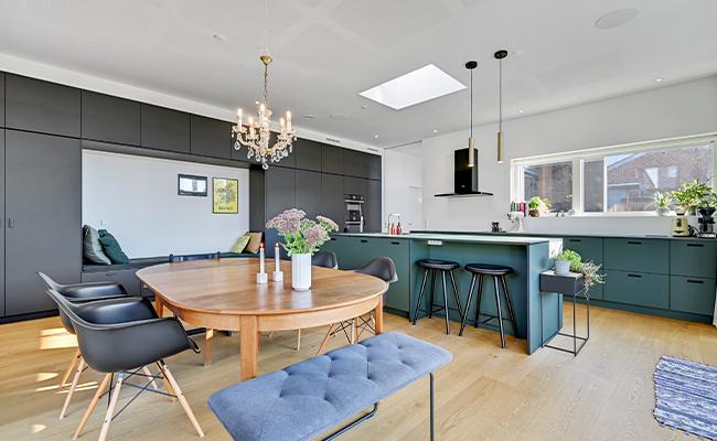 I køkkenalrummet har kunden valgt inventar i mørkere farver. Her har vi blandt andet lavet et mørkegråt indbygget skabsparti, der er bygget, så det går fra væg til væg, og som har et lille indbygget siddeområde i midten. I køkkenalrummet har vi derudover bygget køkkenmøbler og en køkkenø, som kunden har valgt i en mørkegrøn farve.