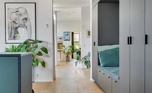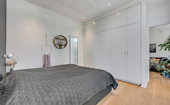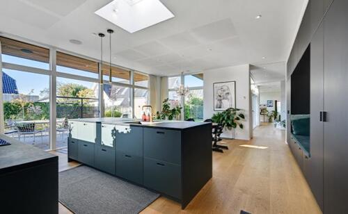 Det mørke inventar og de betongrå fliser på badeværelserne står i flot kontrast til det hvide loft, de hvide vægge og det lyse plankegulv i de øvrige rum. I køkkenalrummet er der samtidig lavet et ovenlysvindue, der giver lys og oplyser den mørke køkkenø, hvilket skaber en god balance mellem det mørke og lyse. Ovenlysvinduet øger desuden fornemmelsen af loftshøjden, så køkkenalrummet virker større.