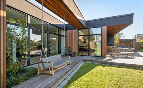 Huset er pudset med mørkt antracitgråt puds og bygget med trælister. Det mørke puds og de sorte vinduer på husets facade står i flot kontrast til de gyldne trælister, og giver sammen med det arkitektoniske design et moderne udtryk til huset.