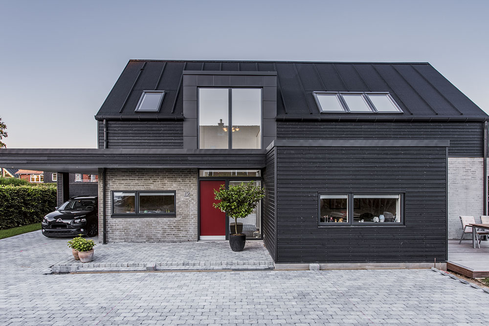 Udenfor på trempelhuset har vi som nævnt leget med kontrasterne mellem den lyse underetage og den mørke overetage, hvilket er med til at give den klassiske villa et mere moderne præg.