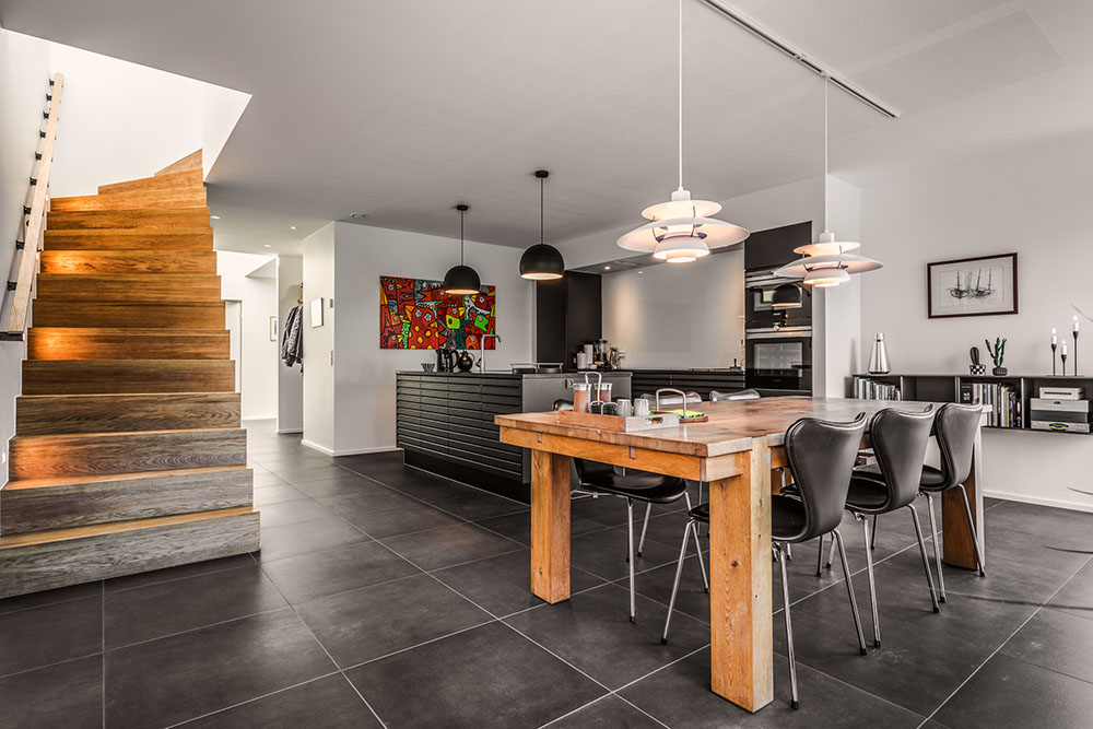 Træder man indenfor i køkkenalrummet, vil man også her kunne opleve spillet mellem det mørke og det lyse. Her står det sorte flisegulv og det sorte køkken i kontrast til de hvide vægge og loft. I køkkenalrummet er der desuden store hvide vinduespartier, der giver masser af lys ind i køkkenet.