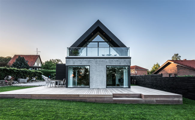 Dette samspil mellem det horisontale og det vertikale er med til at skabe en spændende dynamik til huset. Denne dynamik går desuden igen ved husets gavl, hvor de store firkantede vinduespartier i stueetagen står i kontrast til det trekantede vinduesparti i overetagen, der leder ud til den overdækkede tagterrasse.